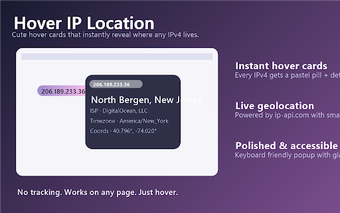 Hover IP Location to darmowy dodatek do przeglądarki Chrome, który umożliwia szybkie sprawdzanie lokalizacji adresów IPv4 na stronach internetowych. Po najechaniu myszką na dowolny adres IP, użytkownik otrzymuje estetyczny popup w pastelowych kolorach, który prezentuje szczegółowe informacje o geolokalizacji. Program wyświetla dane takie jak dostawca usług internetowych (ISP), numer systemu autonomicznego (ASN), strefa czasowa oraz współrzędne geograficzne gotowe do użycia na mapach.